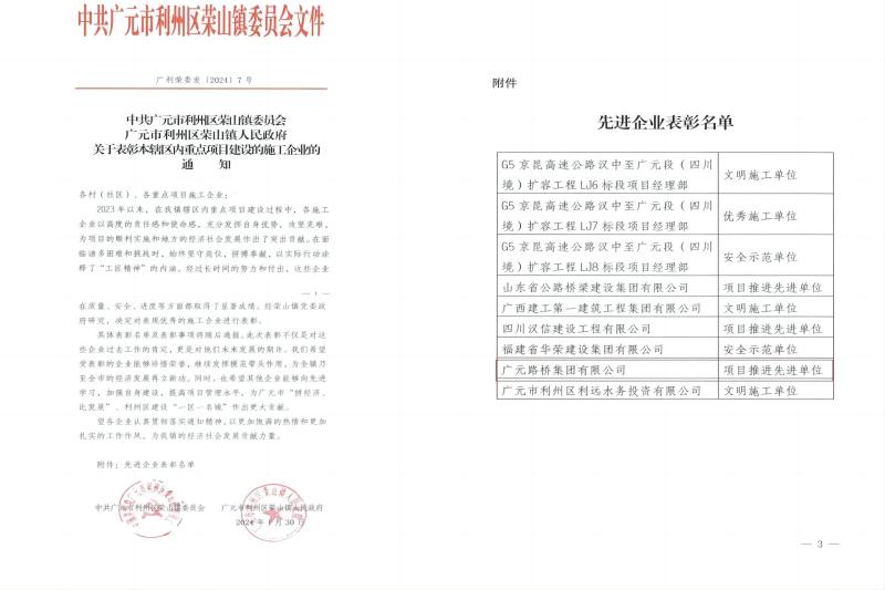 1月30日,公司收到利州區(qū)榮山鎮(zhèn)委員會、榮山鎮(zhèn)人民政府發(fā)來的關(guān)于表彰本轄區(qū)內(nèi)重點項目建設(shè)的施工企業(yè)的通知{廣利榮委發(fā)(2024)7號},路橋集團(tuán)被點名表彰,路橋集團(tuán)榮山鎮(zhèn)高坑口至周家壩項目部在面對建設(shè)前期諸多困難和挑戰(zhàn)時,迎難而上,發(fā)揚拼搏奉獻(xiàn),以實際精神詮釋了“工匠精神”的內(nèi)涵。