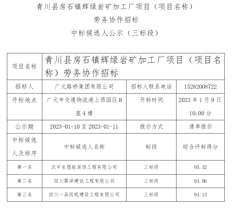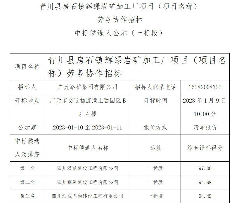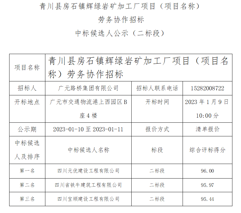 青川縣房石鎮(zhèn)輝綠巖礦加工廠項(xiàng)目(項(xiàng)目名稱) 勞務(wù)協(xié)作招標(biāo)中標(biāo)候選人公示